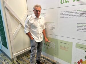 I can also attest that one attribute you can feel, more than see, is a certain vibrant energy, pushing visitors to think about what they can do to help combat climate change. The museum is not simply about entertaining your curiosity. It is very much about awakening an ardor for improvement. The stated mission is “to activate a tipping point on climate mitigation in the Chicago region through education, stimulating critical thought, and inspiring and facilitating action.” It does this so far with minimal staff, just one part-time coordinator and a bevy of enthusiastic volunteers. Nonetheless, one goal in raising funds is to make the coordinator’s job full-time and phase in an executive director. In short, if you care about climate change and want to get involved, the CAM board and volunteers are more than willing to engage your energy. Docents and board members already host about 100 events per year including group tours. The exhibits share information about everything from building energy use to the role of food production in climate change to lifestyle and city planning questions impacting climate.